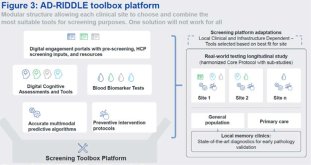 AD-Riddle riunisce 24 centri di ricerca (clinica, farmaceutica, biologica, bio-ingegneristica, informatica, oltre ad associazioni di familiari e pazienti con demenza) allo scopo di colmare la distanza fra l’individuazione precoce dei soggetti a rischio di malattia -oggi affidata solo a centri specialistici non sempre accessibili a tutta la popolazione- e la presa in carico da parte dei sistemi sanitari, che spesso avviene quando la malattia è già molto avanzata.